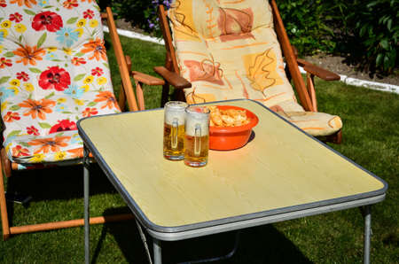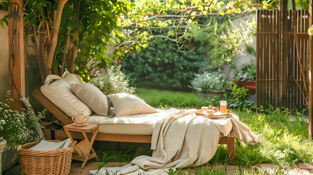 Chaise lounge in garden with wooden basket and tea table, retro style, cozy nook
