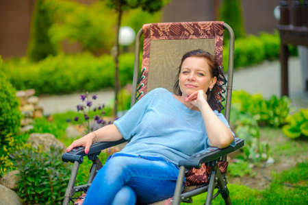 Wooden deck chair on the lawn in a cozy garden with flowers