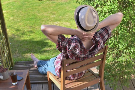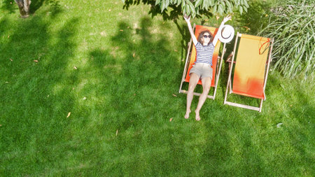 Woman relaxes in summer garden in sunbed deckchair on grass, young girl outdoors in green park on weekend, aerial drone view from above