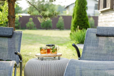 Many deck chairs and pillows with wooden table in the courtyard is surrounded by shady green grass. Comfortable pillows on outdoor patio chair and table in garden. Summer vacation. Selective focus.