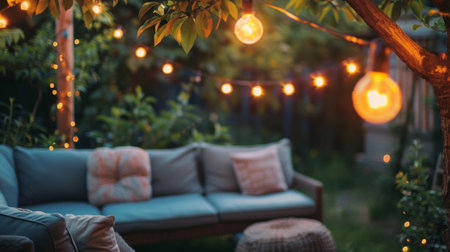 A cozy outdoor seating area with solarpowered string lights strung from tree branches perfect for summer nights