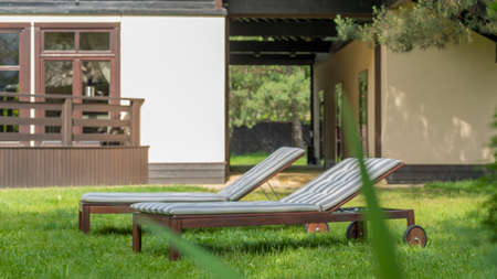 Lounge chairs on the backyard in a beautiful garden. Two empty sunbeds on the grass. Concepts of recreation, tanning in the yard.
