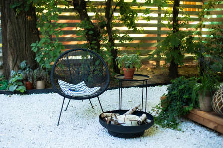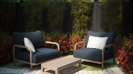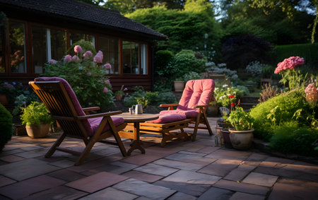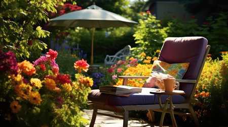 Sunshine daytime backyard chair plants. Relax bench. Generate AI