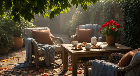 A cozy outdoor patio wicker chairs with blankets and pillows, a wooden table with coffee and pastries, and red flowers.