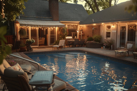 Generative AI : Small pool and garden furniture in backyard with beautiful manicured lawn and flower bed on warm sunny summer day against backdrop of blue sky with clouds