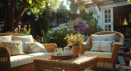 A patio adorned with wicker furniture and vibrant flowers in bloom under the sun.