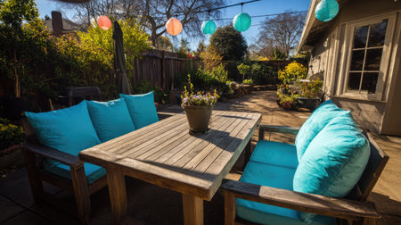 This inviting outdoor patio features a rustic wooden table surrounded by soft blue cushions and adorned with colorful lanterns, perfect for relaxation.
