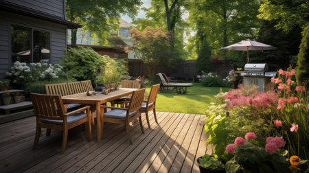 Outdoor dining table and barbeque grill in the back yard of a house. Generative AI illustration