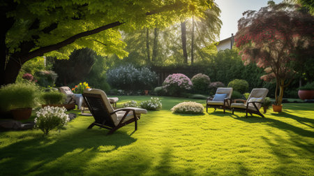 Serene backyard garden scene with green grass, blooming flowers, and cozy patio lounge chairs