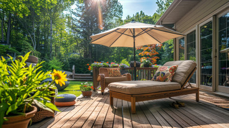 outdoor lounge area, sunny backyard oasis featuring cozy lounge chairs and chic umbrella, perfect for unwinding and embracing the outdoor scenery