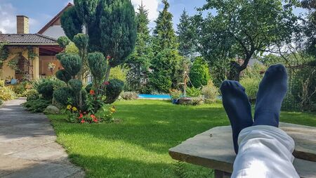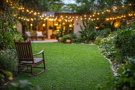 A cozy backyard with a green lawn, a rocking chair and a garland strung between the trees. Recreation area on a country site.