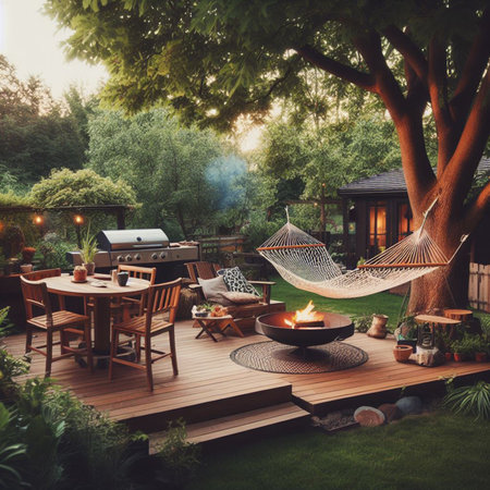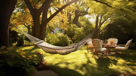 backyard escape with hammock and deck chairs for reading and relaxing, created with generative ai