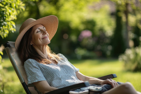 A woman sits peacefully in a garden chair, basking in the sun, surrounded by greenery and blooming flowers.