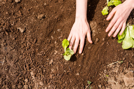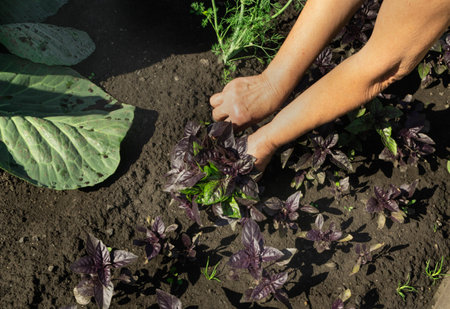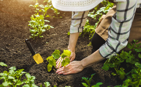 Hands of Caucasian female gardener mulching a freshly transplanted seedling, gently touching the herbs green leaves