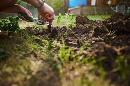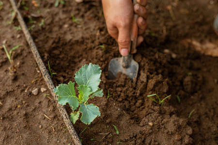 Gardening concept a young male gardener taking care of a vegetable by shoveling the soil around the plant.