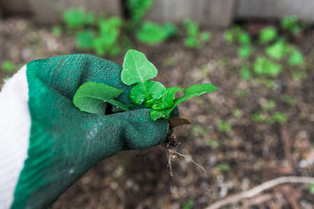 weeds removed by hand wearing gardening gloves, concept of gardening and taking care of your backyard
