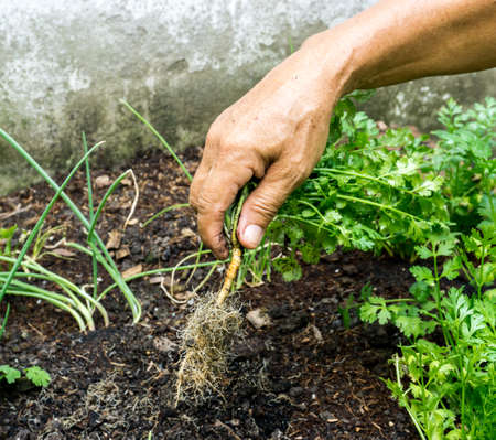 Coriander, the main vegetable in Thailand. coriander in the hand of old man