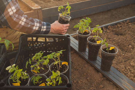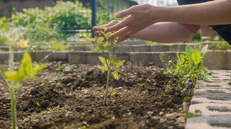 Details: hands of a farmer, agriculturist planting green sapling with his hands in fertile ground. Woman gardener plants tomato seedling in open air in early spring. Eco friendly agriculture concept.