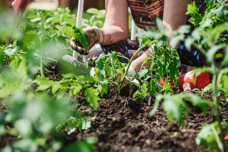 Woman gardener planting tomato seedlings in the ground in her garden in spring