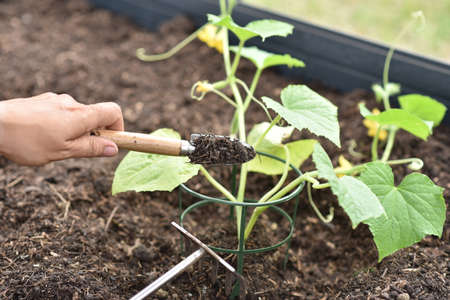 Young cucumber seedlings or zucchini in ground. Gardening Tools. Spring work in garden for planting.