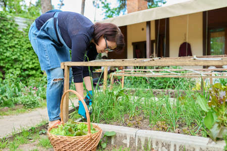 Woman harvesting dill lettuce leaves, green onion arugula herb in basket.