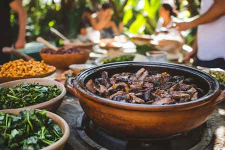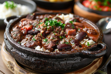 Close up of a delicious feijoada, a traditional Brazilian stew, being served at an outdoor gathering, surrounded by various side dishes