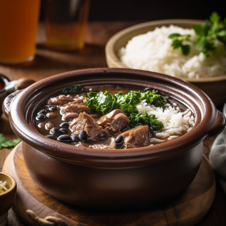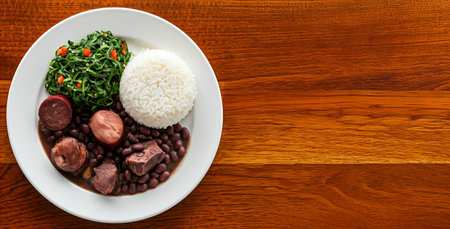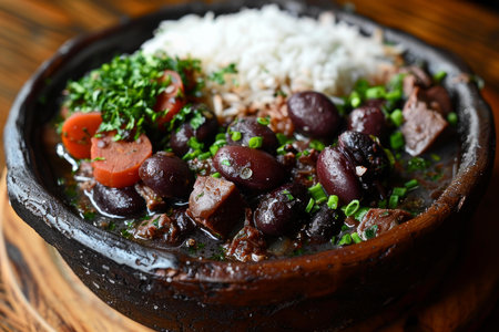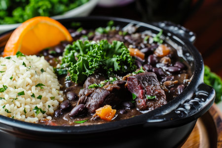 Authentic brazilian feijoada stew with black beans and pork, served with white rice, garnished with greens