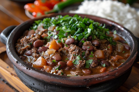 A hearty serving of Brazilian feijoada stew, accompanied by fluffy white rice,