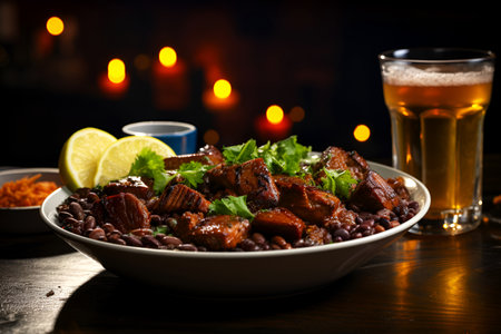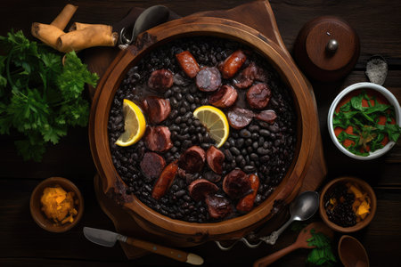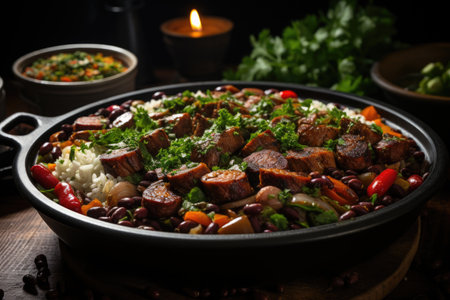 Typical dish of Brazilian cuisine called feijoada, with black beans, bacon, sausag, generative IA