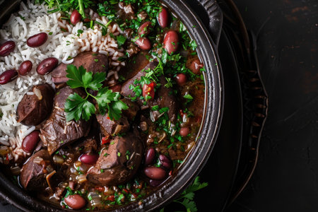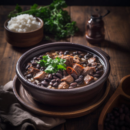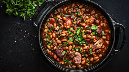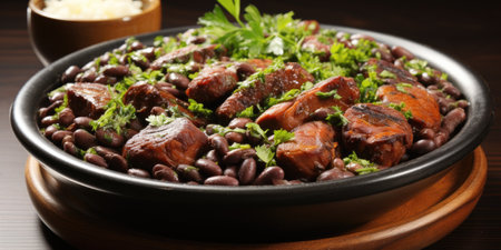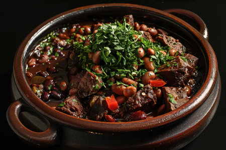 Savory feijoada, a classic brazilian stew with black beans and pork, garnished with fresh parsley