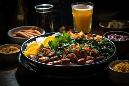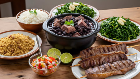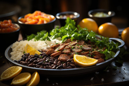 Brazilian table full: feijoada, rice, kale, oranges and farofa., generative AI