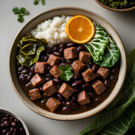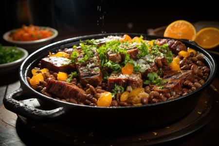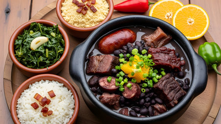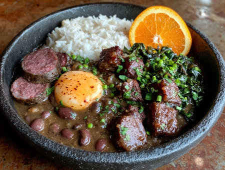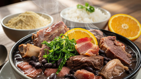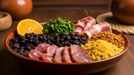 A large features bowl traditional feijoada with black beans, pork, sauteed greens, and orange slices, highlighting Brazilian culinary culture.