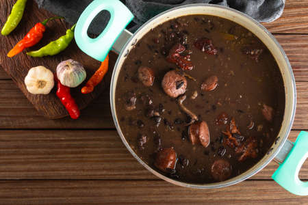 Feijoada. Traditional Brazilian food. Wood background. Top view. Copy space