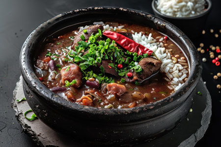 A close-up of a hearty beef and bean stew with rice, chili pepper, and green onions, served in a black ceramic bowl.
