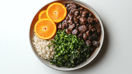 A vibrant bowl of feijoada with rice, orange slice, and collard greens. This delicious brazilian stew is a healthy and flavorful meal.