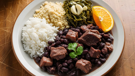 A plate of traditional Brazilian Feijoada featuring black beans with pork, white rice, farofa, kale, and an orange slice. The hearty meal is presented on a rustic wooden table.
