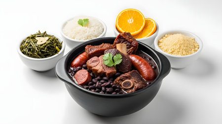 A complete Brazilian Feijoada meal served in a black clay pot, accompanied by white rice, farofa, collard greens, and orange slices. The arrangement is isolated on a white background, highlighting the rich, hearty ingredients of this national dish.