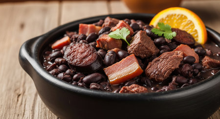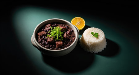 A close-up captures a traditional Feijoada, a Brazilian black bean stew, with rice and an orange slice. The scene highlights the various ingredients in the dish like smoked pork and sausage. Soft lighting enhances the colors and textures of the food, suggesting a culinary experience suitable for food-related projects.