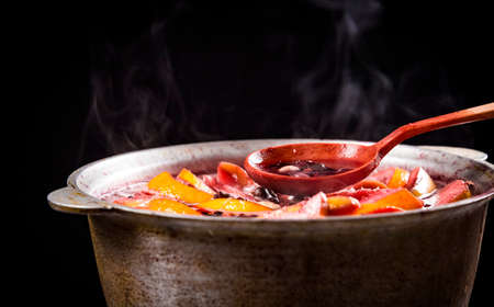 Big kettle pot of traditional hot steaming Christmas drink mulled red spiced wine boiling with apples and citrus with wooden spoon on black background. Christmas party.