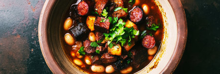 A warm and hearty Fabada stew, featuring smoky chorizo, tender beans, morcilla, and rich broth, with crusty bread on the side for dipping, traditional Spanish dish, banner