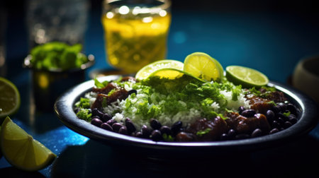 A bowl of rice, beans and lime with a glass, AI