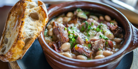 A hearty French cassoulet, with slow-cooked white beans, sausage, duck confit, and bacon, served in a rustic clay pot with crusty bread on the side. The dish feels rich and comforting.