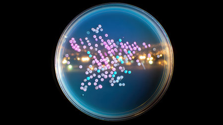 This detailed image showcases a petri dish with vibrant microbial cultures, featuring colorful bubbles and textures, perfect for educational and scientific use.
