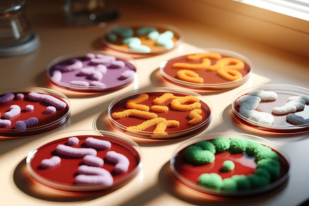Vibrant and colorful petri dishes filled with various cultures demonstrate scientific research in a modern laboratory setting. Each dish reveals microbial growth.