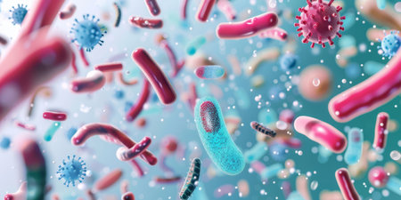 Illustration of bacteria and viruses floating in a colorful microscopic scene
