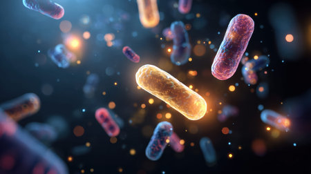 Glowing bacteria float in a clean medical setting, showing various shapes and colors in an abstract representation of the gut microbiome.
