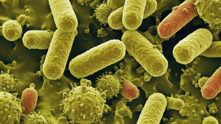 a detailed microscopic view of numerous bacteria cells with orange and red highlights in a blue environment