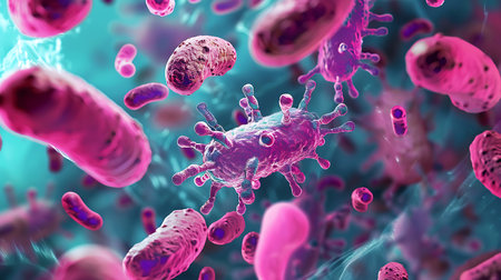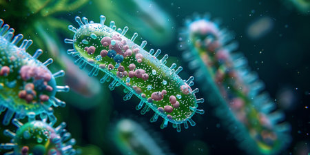 Microscopic close-up of a viral infection, capturing the detailed structure of bacteria and germs, perfect for medical science content