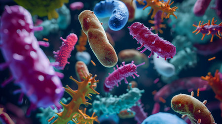 This vibrant microscopic illustration showcases bacteria and microorganisms amid an abstract background. It represents the beauty of scientific exploration and the complexity of life.