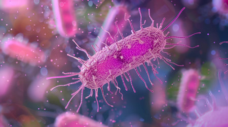 Escherichia coli bacteria, 3D illustration. E. coli is a Gram-negative rod-shaped motile bacterium covered with flagella
